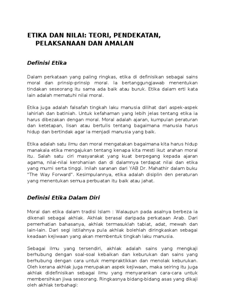 Nilai etik atau etis sering disebut sebagai nilai moral akhlak atau budi pekerti. Istilah ini kemungkinan pertama kali diungkapkan oleh pythagoras c. ABDUL RAHMAN BIN AB KARIM ISI KANDUNGAN NO PERKARA MUKA SURAT.